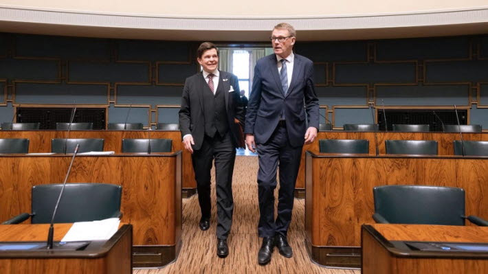 Speaker Andreas Norlén and Speaker of the Eduskunta (Finnish Parliament) Matti Vanhanen in the Eduskunta Plenary Hall.