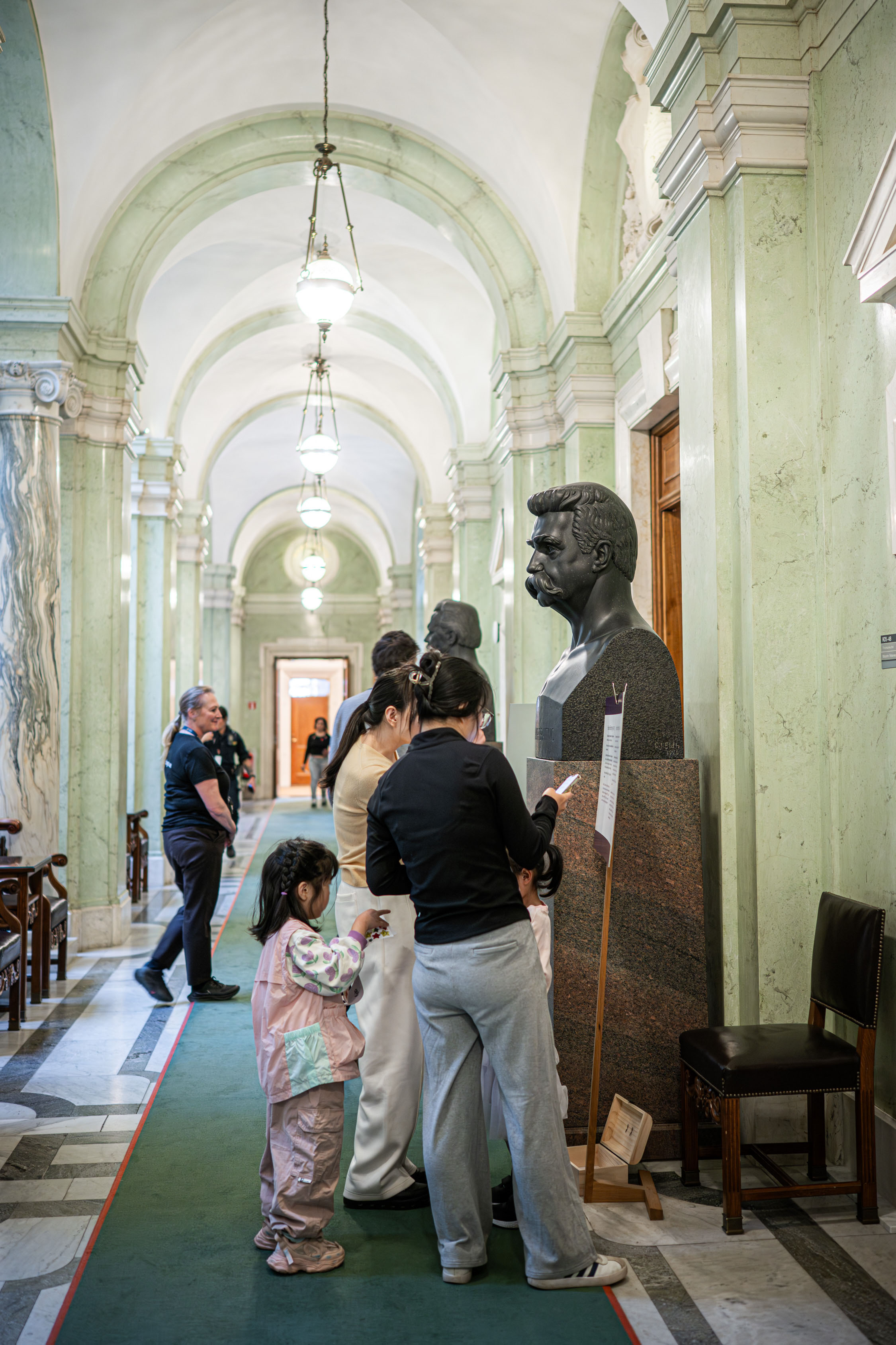 18 april 2026. Besökare vid byst av Hjalmar Branting i Trapphallen i Riksdagshuset.
