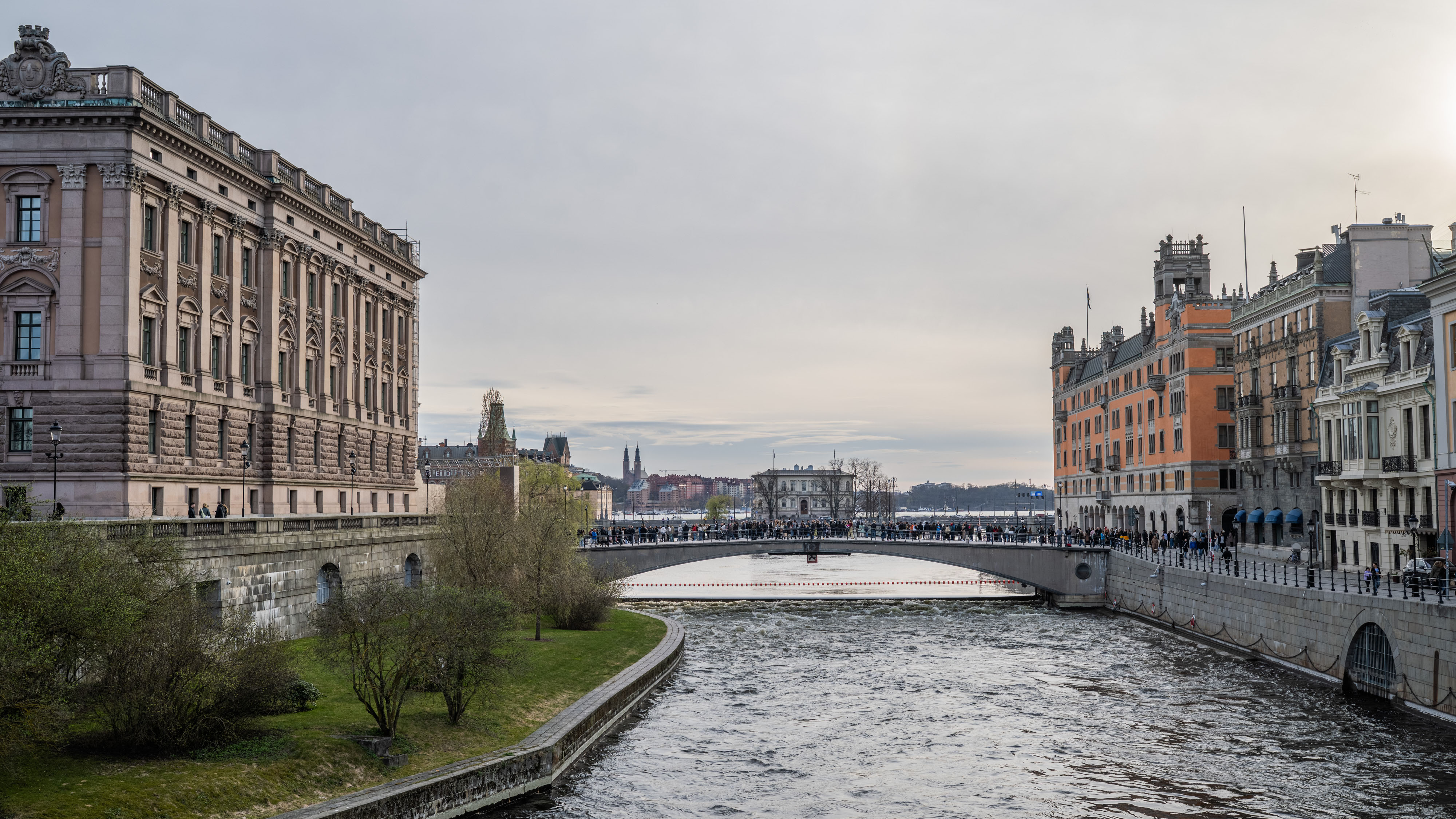 Vy mot Riksdagshuset från Gamla stan. Folk promenerar på Stallbron och Riksgatan.